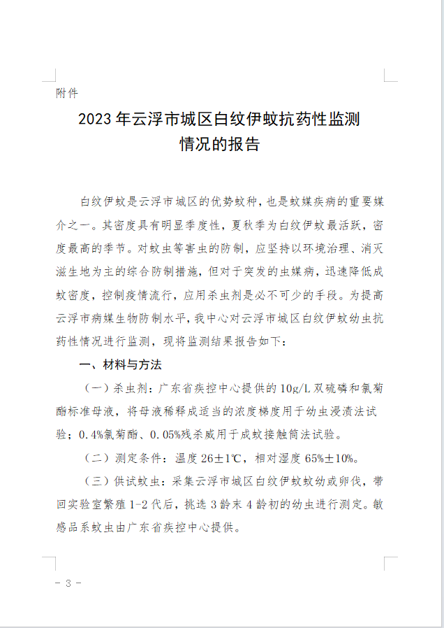 1、參照云浮市疾病預(yù)防控制中心關(guān)于2023年云浮市城區(qū)白紋伊蚊抗藥性監(jiān)測情況的報告(云疾控報(2023)39號)的要求,本項(xiàng)目擬使用抗性低的藥物,確保防治效果,藥物主要包括:≥0.005%溴鼠靈餌劑、≥4.5%倍硫磷殺蟲顆粒劑、≥10%殘殺威復(fù)配懸浮劑、≥1%殘殺威復(fù)配熱霧劑、≥18%殘殺威乳油;使用藥劑必須正規(guī)廠家生產(chǎn),需農(nóng)藥登記證持有人授權(quán),提供三證,MSDS。