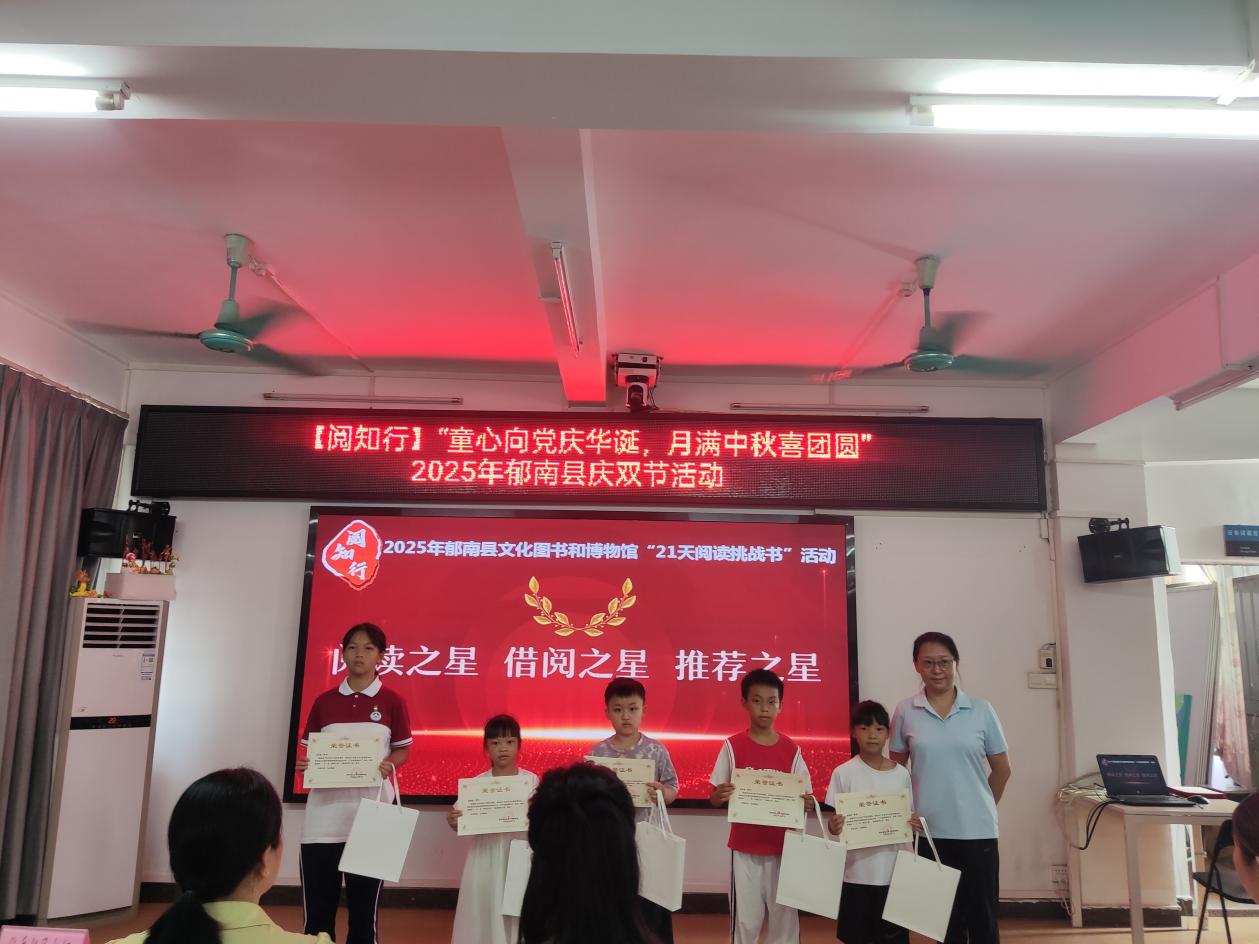 以榮譽見證成長,以書香潤澤心靈?;顒蝇F(xiàn)場先后為“2025年世界閱讀日粵港澳創(chuàng)作比賽(郁南賽區(qū))”及“2025年郁南縣21天閱讀挑戰(zhàn)書”活動中表現(xiàn)優(yōu)異的讀者頒發(fā)了榮譽證書和獎品。頒獎不僅是對閱讀成果的肯定,更是對“全民閱讀”理念的生動弘揚,激勵更多小讀者愛上閱讀、樂于表達。