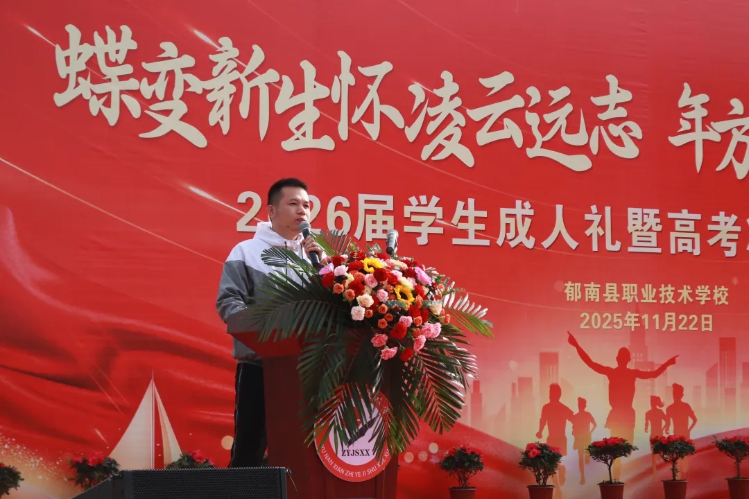 溫伯榮副縣長結(jié)合自身經(jīng)歷,對學子深切寄語。他勉勵學子“立鴻鵠之志,涵養(yǎng)家國情懷,將個人理想融入國家發(fā)展大局,樹立技能報國、實干興邦的志向”,鼓勵他們努力學習,以昂揚姿態(tài)迎接職教高考最后50天,學有所成后報效祖國、投身“百千萬工程”建設(shè);同時強調(diào)職業(yè)教育是推動縣域經(jīng)濟高質(zhì)量發(fā)展的關(guān)鍵力量,希望學校深化產(chǎn)教融合,家校協(xié)同育人,共同為青年成長保駕護航。 家長代表歐桂芳女士深情發(fā)言:“希望你們讀懂十八歲的責任,學會獨立思考,勇于擔當;握緊五十天的堅持,科學規(guī)劃,分秒必爭?!?她表示,家長將做好后勤支持與心理疏導,做孩子最堅定的后盾,陪伴他們走過人生關(guān)鍵一程。 學生代表李鎂怡鏗鏘宣誓:“以成年人的堅韌,直面挑戰(zhàn),永不言棄。將挫折看作成長的階梯,用拼搏書寫青春篇章!” 她號召全體同學珍惜最后沖刺時光,不負韶華,用優(yōu)異成績回報師長厚望。 學校黨委書記陳永明登臺致辭:十八歲是憲法賦予責任的新起點,青年應(yīng)感恩父母、師長和祖國,以習近平總書記“青春是用來奮斗的”名言為動力。面對五十天后的高考,他呼吁化壓力為動力,號召大家全力以赴沖刺高考,堅持努力,保持信心,珍惜時光刻苦學習。鼓勵以成人姿態(tài)迎接挑戰(zhàn),發(fā)揮潛力。最后,他以“功成不必在我,功成必定有我”的擔當精神勉勵學生,以責任砥礪品格、以勤奮開創(chuàng)未來。當激昂的鼓點漸歇,郁南職校足球場的氛圍愈發(fā)莊重熱烈,成人禮暨誓師大會迎來最動人心魄的高光時刻。 互動環(huán)節(jié)溫情與激昂交織:各班班長向班主任獻花致謝,感恩師恩陪伴;領(lǐng)導、家長與教師為學生佩戴成人徽章,見證青春蛻變,寓意責任從家庭向社會傳遞;全體2026屆考生高舉右拳、目光堅定,“五十天,我們分秒必爭!五十天,我們百折不撓!……”鏗鏘誓言響徹云霄,彰顯逐夢考場的昂揚斗志。隨后,學子們身著整齊服裝,昂首挺胸依次通過成人門、成功門,他們身后是家長欣慰的目光、老師鼓勵的眼神,身前是充滿希望的未來,這一瞬間成為他們從青澀走向成熟的珍貴印記,定格成青春最美的畫面。 這場大會既是青春加冕的莊嚴盛典,更是逐夢出征的精神動員令!通過一系列莊重儀式,既讓學子在成人禮中深切體悟使命擔當,更以鏗鏘誓言與昂揚姿態(tài),為 2026 年職教高考吹響沖鋒集結(jié)號,凝聚起決勝考場、書寫青春華章的磅礴力量!