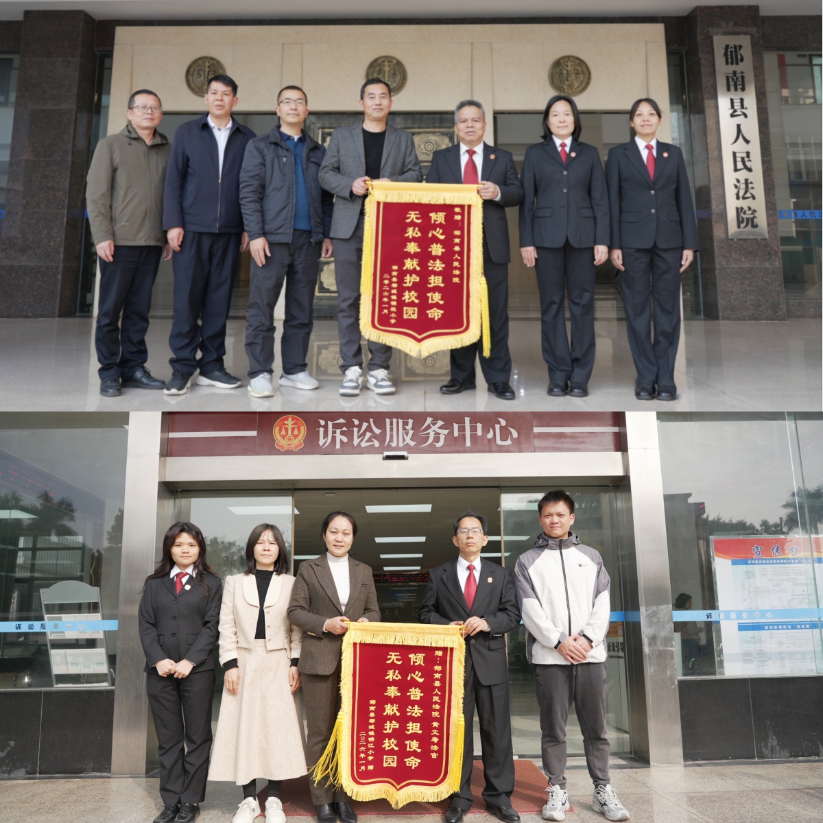 近日,郁南法院李法官和黃法官分別收到了來(lái)自轄區(qū)錦枝小學(xué)、錦江小學(xué)送來(lái)的致謝錦旗,鮮紅的錦旗上,“傾心普法擔(dān)使命 無(wú)私奉獻(xiàn)護(hù)校園”的燙金大字熠熠生輝,既是對(duì)法院法治副校長(zhǎng)工作的高度認(rèn)可,更是院校共建協(xié)同推進(jìn)青少年法治教育工作的生動(dòng)寫(xiě)照。