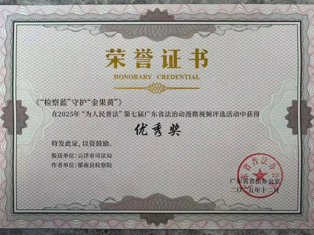 12月17日上午,由廣東省司法廳、廣東省普法辦主辦的2025年“為人民普法”第七屆廣東省法治動(dòng)漫微視頻評(píng)選活動(dòng)在汕尾舉行。經(jīng)過(guò)網(wǎng)絡(luò)點(diǎn)贊投票、專家評(píng)審,郁南縣人民檢察院原創(chuàng)法治微視頻《拆穿詐騙劇本,重繪“幫忙”邊界》《“檢察藍(lán)”守護(hù)“金果黃”》在省直相關(guān)單位、各地市報(bào)送的620余個(gè)作品中脫穎而出,分別獲得銅獎(jiǎng)和優(yōu)秀獎(jiǎng)。